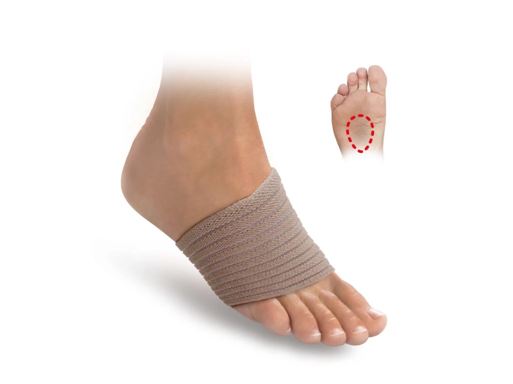 Bandáže stahují přední část nohy v místě prstních kloubů a podepírají příčnou klenbu latexovým srdíčkem.