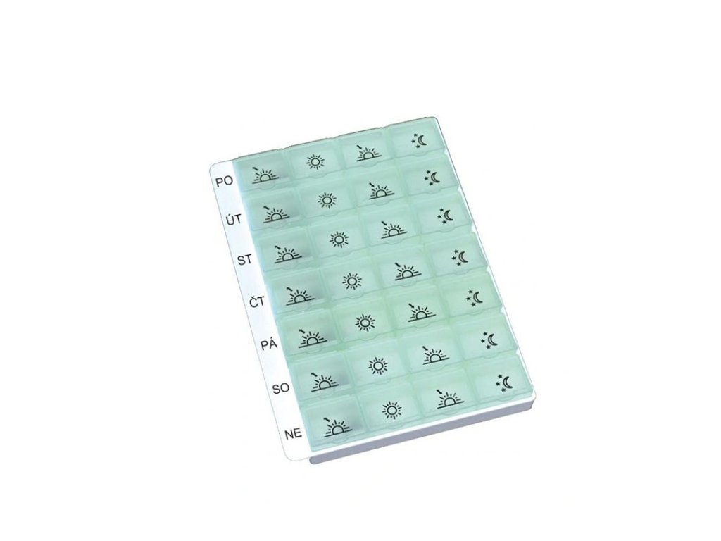 Dávkovače léků - denní umožňuje rozdělení léků na celý den/týden. Dávkovač slouží k přehlednému uspořádání a spolehlivému dávkování léků doma nebo na cestách.